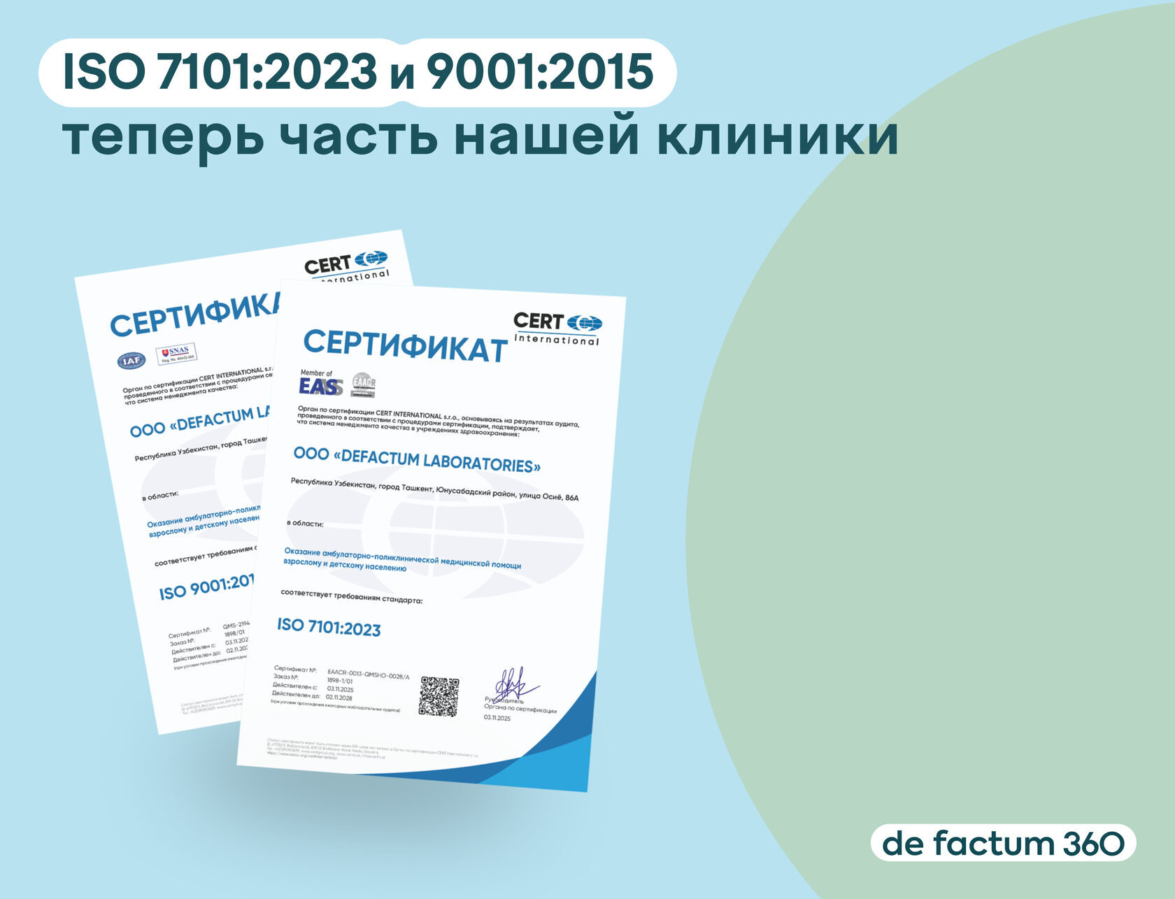 De factum’da biz doimo sizning klinikada bo‘lishingiz e’tibor, g‘amxo‘rlik va yuqori darajadagi xizmat bilan bog‘liq bo‘lishi uchun barcha imkoniyatlarni ishga solamiz. Bugun biz uchun haqiqatan ham muhim bo‘lgan narsani baham ko‘rishdan mamnunmiz: bizning klinikamiz ISO 7101:2023 va ISO 9001 xalqaro sifat standartlarini rasman joriy etdi.