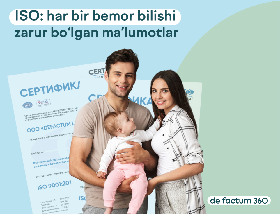 de factum ISO 7101:2023 va ISO 9001:2015 standartlari bo‘yicha sifatni boshqarish tizimini joriy etdi va tashqi mustaqil auditdan o‘tdi. Bemor uchun bu shuni anglatadiki, klinika oldindan belgilangan qoidalar asosida ishlaydi va sifat nafaqat ichki bayonotlar, balki tashqaridan tekshiruv orqali ham tasdiqlanadi.
